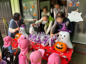 ちょっぴり怖いけど、と~っても楽しい‼🎃 ハロウィンのお話を聞いたり、楽しいペープサートを見た後は、みんな可愛いオバケ👻に変身‼かぼちゃのバッグを持ってトリックオアトリート!!