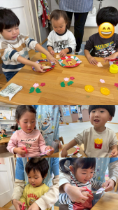 りんりんさんは、1月の製作に取り組みました。ハサミ✄にも初挑戦‼ 慎重に慎重に・・・チョッキン!上手に切れたよ‼ 糊付けも真剣です。製作楽しい~🤗素敵なお正月飾りができました💕