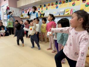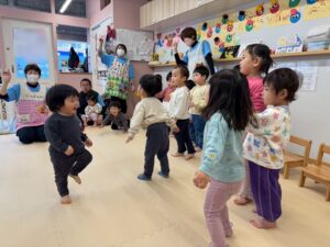 保育士やお兄ちゃんお姉ちゃんのお友だちを見ながら、小さいクラスのお友だちも上手に踊って歌っていますよ❣️